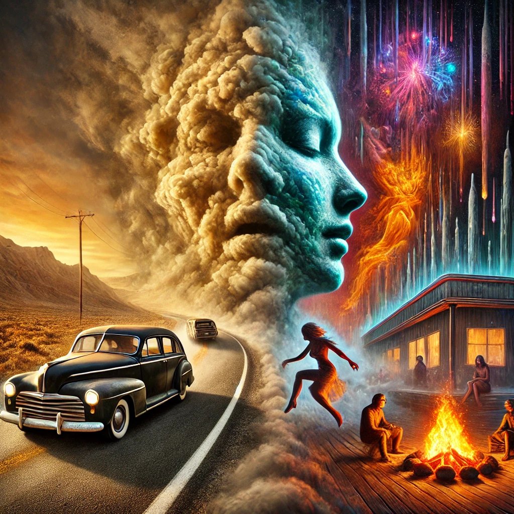 [h2][b]The Restroom at Mile 172 on Route 66[/b][/h2] [h2]The restroom at the Chevron station, located at mile 172 on Route 66, had suffered irreversible decay. It was one of those restrooms where deep cleaning was a futile effort—the only solution was demolition. Grime had metastasized into the microscopic cracks of the floors and walls. Luis compared the thickness of his sneaker soles to the depth of the puddles on the floor and double-checked that his shoelaces were securely tied, ensuring that not a single loop dangled low enough to touch the wet surface.[/h2] [h2]Taking in one last lungful of crisp desert air, he held his breath with the resolve of a diver plunging into the deep and stepped firmly into the men’s room.[/h2] [h2]Inside, the humid stench defied the clenched muscles of his nose. His survival instincts kicked in, prompting him to stretch the neckline of his T-shirt over his nose bridge in a makeshift gas mask.[/h2] [h2]When he emerged, Luis felt a double sense of relief—one for his bladder and another for his lungs.[/h2] [h2]“[i]Luis! Let’s go, babe![/i]”[/h2] [h2]Luis lingered for two extra seconds, savoring the feeling of relief while fixing his gaze on the long stretch of road ahead. The morning sun warmed his chest as he inhaled deeply, savoring the clean air as though it were a fine wine. His mouth twitched into a half-smile. Route 66 lay unmoving before his tired eyes, waiting.[/h2] [h2]“[i]Baaaabe![/i]”[/h2] [h2]This time, Luis’s steps were less assured. They carried him toward the blurry outlines of the three figures waiting for him in the car. Once he slipped on his prescription glasses, the figures sharpened as though conjured by magic: his road trip companions.[/h2] [h2]It was nice while it lasted.[/h2] [h2] [/h2] [h2][b]The 2005 Chevy Cavalier[/b][/h2] [h2]The Chevy Cavalier’s engine coughed like a smoker as Luis started it. The phlegmy, raspy sound reminded him of the mechanic who had given it a tune-up just last week. Luis recalled the man’s raspy reassurances.[/h2] [h2]“Don’t worry about it, Luis,” the mechanic had said between bouts of hacking. “I tuned this baby up nice and good! Go ahead, put as many miles on her as you want!”[/h2] [h2]Luis turned off the engine and started it again. [i]Cough, cough, cough.[/i][/h2] [h2]“What’s wrong with the Cavalier, Captain?” Jonathan asked with a smirk.[/h2] [h2]The good thing about traveling with an out-of-state brother-in-law from Louisiana was that the coffee pot was always full, Luis thought to himself.[/h2] [h2]“It’s just got a cold, nothing major,” Luis replied. “We’ll find a mechanic in the next town.”[/h2] [h2]Jonathan let out a hearty laugh, the kind that made his frog-like eyes bulge. “A [i]cold,[/i] huh? Man, you’re something else!”[/h2] [h2]The bad thing about traveling with a brother-in-law from Louisiana, Luis reflected, was that Cajuns had a much stronger sense of humor than anyone from Chicago. They laughed easier, louder, and with the kind of joy that made Luis feel like they were rubbing it in his face.[/h2] [h2]“Man, Captain! You’re gonna need a bottle of cough syrup for this baby! Did you bring a prescription?” Jonathan howled, wheezing as he slapped the dashboard.[/h2] [h2]Valenna and Guada giggled along, though their laughter felt more like background noise. Valenna laughed to prove she was chill, while Guada, his girlfriend, laughed to be agreeable. Luis mustered a weak chuckle to keep the mood comfortable.[/h2] [h2]The Cavalier and Jonathan went back and forth—[i]cough, cough, cough[/i] and “Ha! Ha! Ha!”—as Luis turned up the radio and put the car in motion. The highway merged seamlessly with the morning sun, stretching out before them in all its golden glory.[/h2] [h2]Luis exhaled and shifted into fifth gear. For the first time that morning, his smile felt genuine.[/h2] [h2] [/h2] [h2][b]30 Miles from the Chevron at Mile 172[/b][/h2] [h2]Silence reigned in the car. Normally, Luis appreciated the peace that silence could bring, but this time, it felt like an unsettling solitude.[/h2] [h2]Valenna was absorbed in a tattered book on crystals or some kind of spiritual nonsense. Her furrowed expression was that of someone reading an ancient manuscript instead of a New Age paperback. From the corner of his eye, Luis glimpsed a red-and-yellow star-shaped diagram on the page she was studying.[/h2] [h2][i]Valenna.[/i][/h2] [h2]The oppressive silence guided Luis’s mind back to the night they had first met. She’d worn a flowy dress, bright red and yellow, that had caught his eye as soon as she crossed the threshold of a college bar in downtown Chicago.[/h2] [h2]Luis had been out celebrating the end of final exams with his engineering classmates. It was December, and his pale, winter-worn face showed the toll of four exams in one month. Weeks of locking himself in a study room had left him ashen, starved of sunlight. His taste buds had grown weary of constant coffee, and his first beer that night had felt like a revelation. The second beer gave him courage.[/h2] [h2]With half a glass still in hand, Luis approached the mysterious woman in red and yellow. Each step revealed more details: worn sandals, a pseudo-tribal tattoo on her calf, unpolished nails, and dreadlocks just long enough to sway as she moved. Her smile struck him like an earthquake—a 6.5 on the Richter scale.[/h2] [h2]Her smile was the bait; her bohemian energy, the hook. Words were minimal, the pace swift. By the end of the night, Luis found himself guiding her toward his apartment, high on the adrenaline of conquest.[/h2] [h2]Three years later, somewhere around 60 miles past that Chevron restroom, the memory of his triumph lingered, but the thrill of pride had faded.[/h2] [h2] [/h2] [h2][b]A Quiet Town off the Road[/b][/h2] [h2]The Chevy rumbled onto a dirt road, leaving its mark on the soft, untraveled surface. The town that greeted them seemed frozen in time, a re